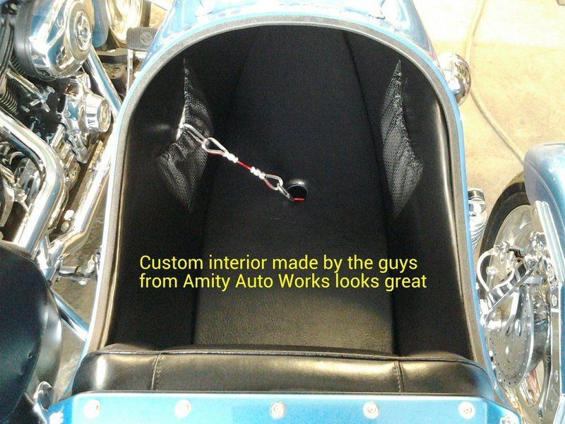 This 2011 Harley Davidson FatBoy owned by Joe and Amber of Orange County Nursery came to me as just a normal two wheeled motorcycle. The big problem Joe was having with his bike was the fact he was unable to take his little girl Amber on rides with him and was having to leave her home. After seeing me with kismet on my bike he had asked me if I could build a box for Amber to ride in when he took the bike out but Amber was much too big and heavy for that. I told him I can put together a trailer for him that she can ride in or we can order a sidecar that she could ride. Seeing as he always wanted a motorcycle with a sidecar he opted for that choice. We ordered the sidecar and when it came to the shop I installed it onto the motorcycle and made a few custom changes to accommodate Amber in the sidecar. Instead of having a seat in the sidecar we remove that and installed a platform that went the length of the sidecar so she could not only sit comfortably but laid down or stand up. I also installed a custom restraining system for her so she could not be thrown out of the sidecar.